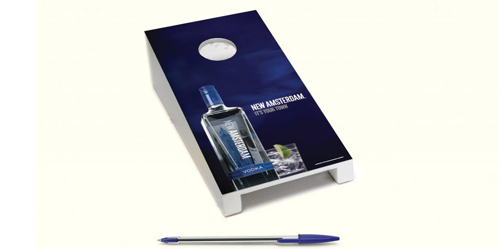 Tabletop cornhole includes one scoring platform and 2 sets of 4 tossing bags. The tossing bags are available in 10 colors and measure 1in by 1in. Each 5in by 10in scoring platform can be imprinted with a 4 color process logo. The scoring platform is made of wood and painted white.